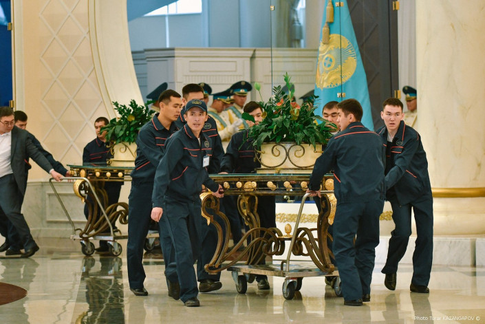 В президентском дворце Акорда сегодня меняли декорации. И со стороны это чем-то напоминало пит-стоп, то есть когда машина останавливается во время гонки, а слаженная команда быстро меняет колеса, заправляет авто и подкручивает все что нужно. Только вместо автотехников в Акорде были уборщицы, грузчики и прочие специалисты, которые работали очень и очень быстро. Что же такое происходило в центре казахстанской столицы в пятницу, выясняли Ренат Ташкинбаев и Турар Казангапов.