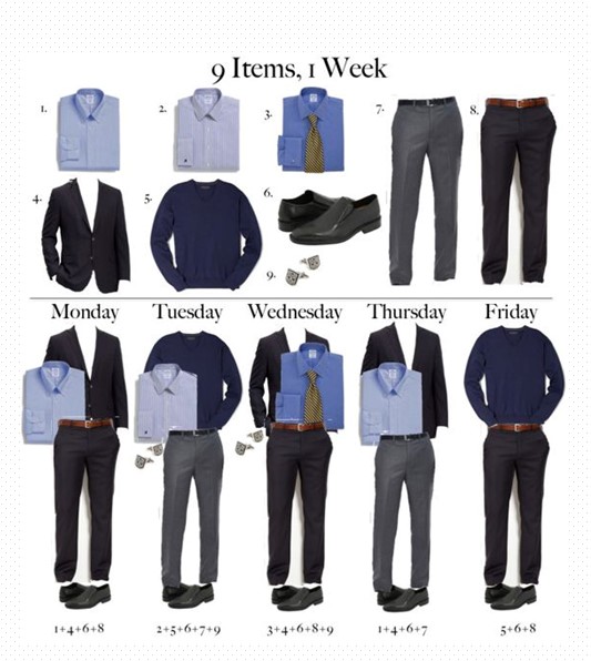 Пример создания мужского гардероба на неделю - два низа, пять верхов