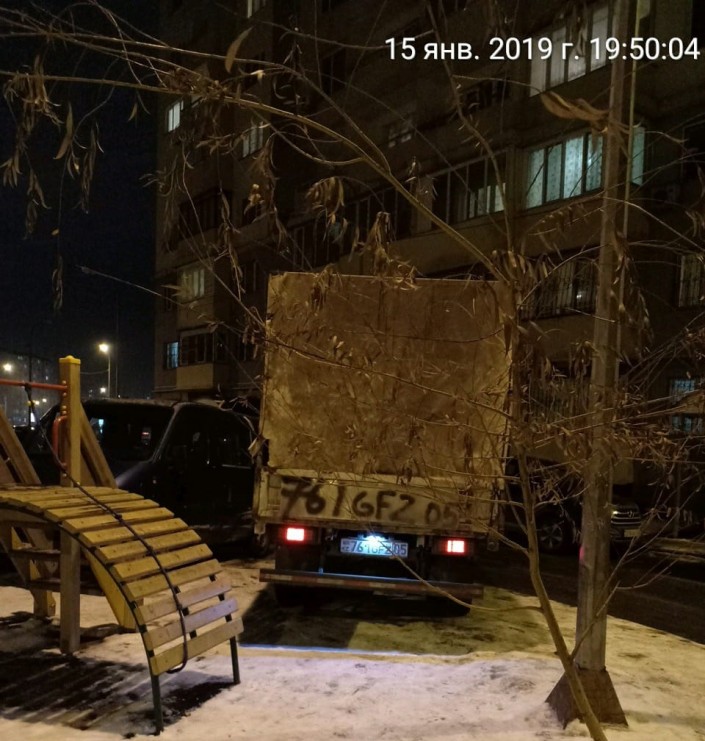 Возвращаемся снова в Алматы. Уже 15 января внимательный гражданин заметил два большегрузных авто, припаркованных на территории детской площадки все в том же микрорайоне Алгабас-1.