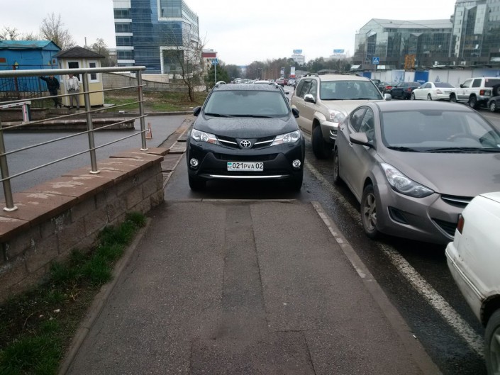 "Мастеров" парковок в Алматы много. На фото автомобили Mitsubishi и Toyota оставили прямо на пешеходном тротуаре.