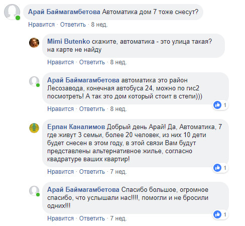 "Автоматика, 7, где живут три семьи, более 20 человек, из них 10 - дети, будет снесен в этом году. В этой связи вам будет предоставлено альтернативное жилье согласно квадратуре ваших квартир!" - поспешил обрадовать жителей аким. Судя по записи, с того момента прошло семь недель. И жители дома № 7 забеспокоились.