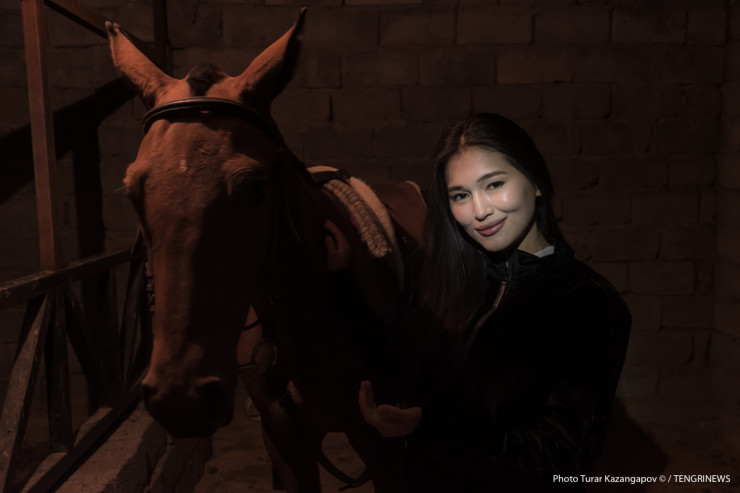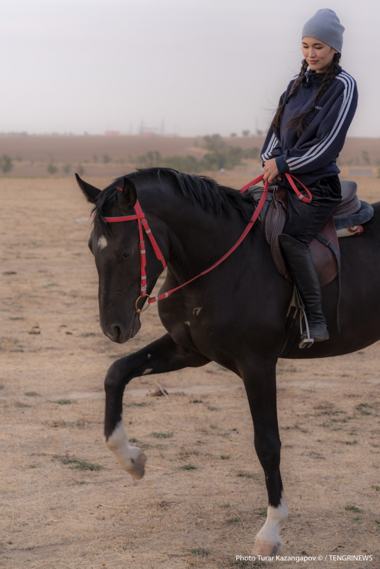 Зовут ее Балнур, фамилия Садык, ей 23 года. На первый взгляд это хрупкая девушка, но стоит ей сесть на лошадь, как она тут же превращается в грациозную и даже местами бесстрашную всадницу.