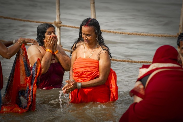 Первыми в воду заходят обнаженные отшельники наги, затем другие верующие. В фестивале участвуют адепты самых разных, порой экзотических форм индуистских верований. Люди верят в чудодейственную силу обряда омовения и на протяжении вот уже многих веков исполняют это предписание.