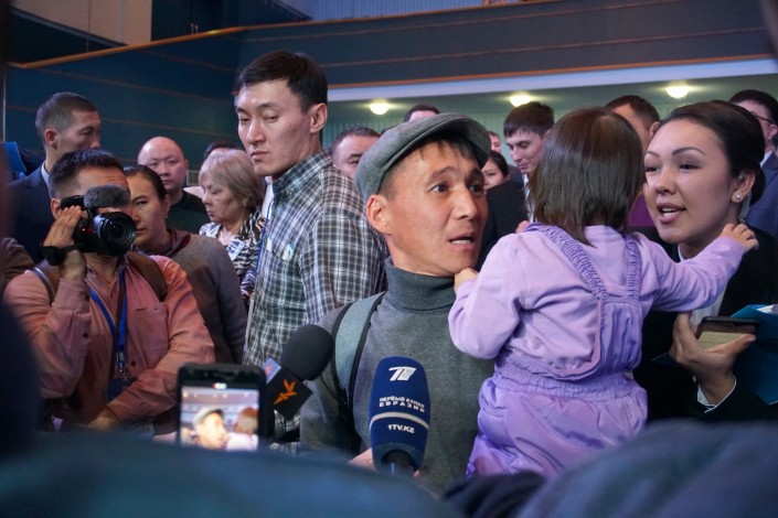 Толпа расступилась, и перед журналистами появился мужчина с ребенком на руках. Это был все тот же отец-одиночка Рысмахан со своей дочерью Инжу.