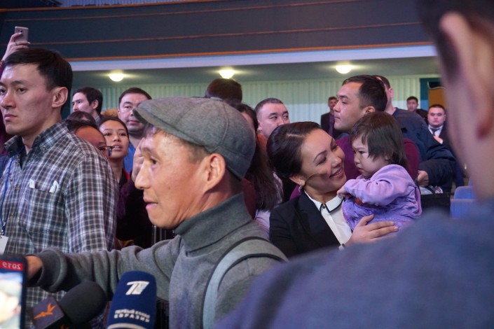 Пресс-секретарь столичного градоначальника Эльвира Жургенбаева, пока отец раздавал интервью журналистам, заботливо взяла его дочку на руки.