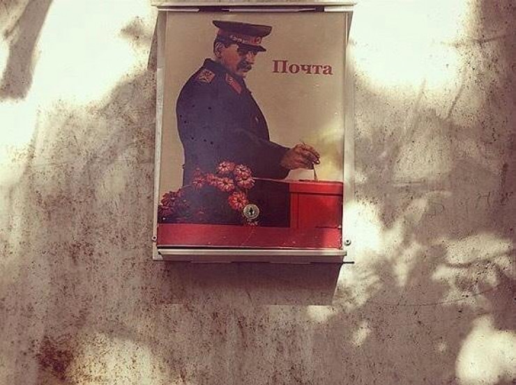 А вот Иосиф Сталин встречается реже. На улице Кабанбай батыра висит вот такой почтовый ящик возле частного дома, на котором вождь СССР изображен в военной форме у трибуны.
