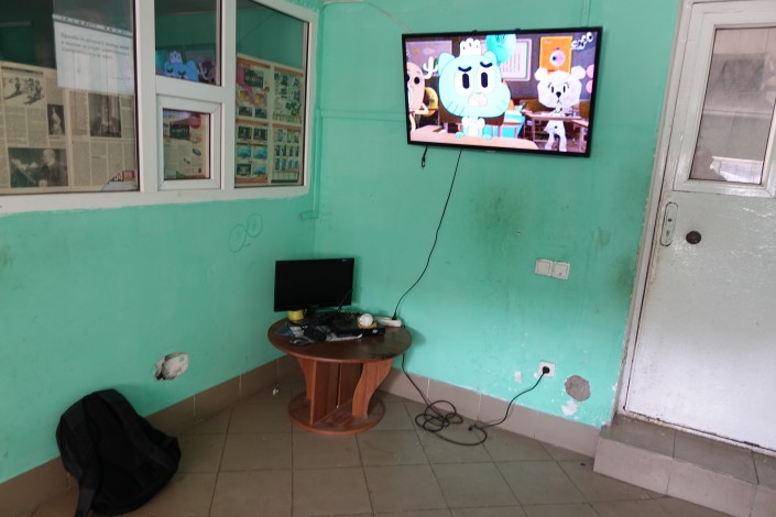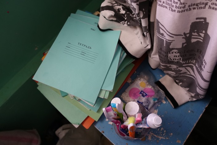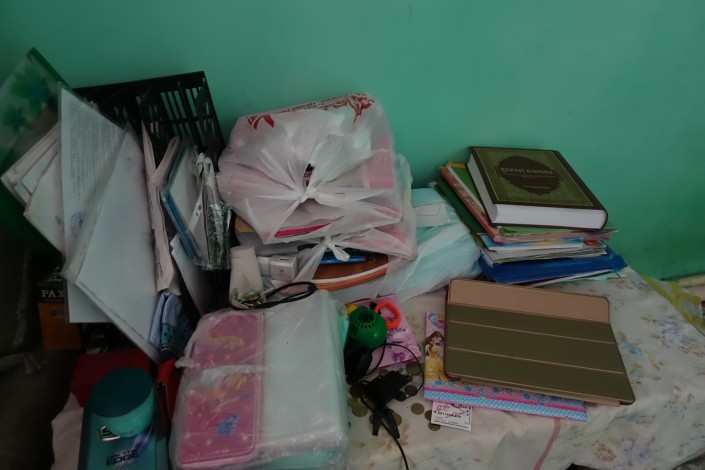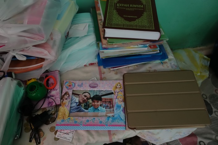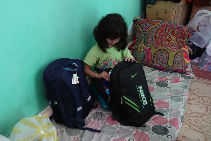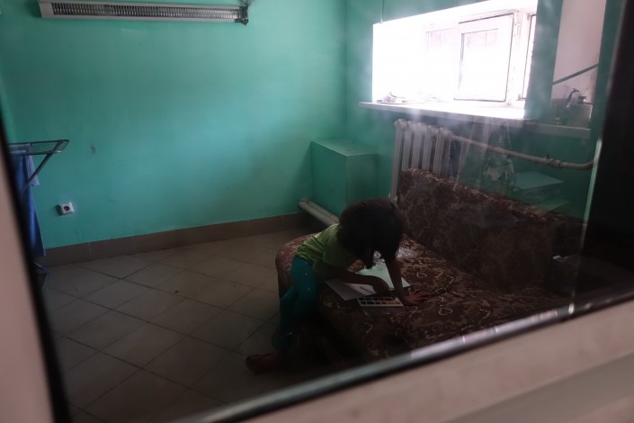 Пока посетителей в автомойке нет, дочь Исатая Инабат смотрит мультики и параллельно разглядывает акварельные краски и тетради, которые ей и ее старшему брату к началу учебного года привезли неравнодушные люди.