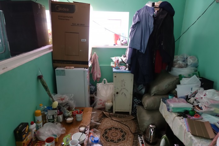В углу маленькой комнаты стоит новый холодильник, который пожертвовал кто-то из добрых людей.