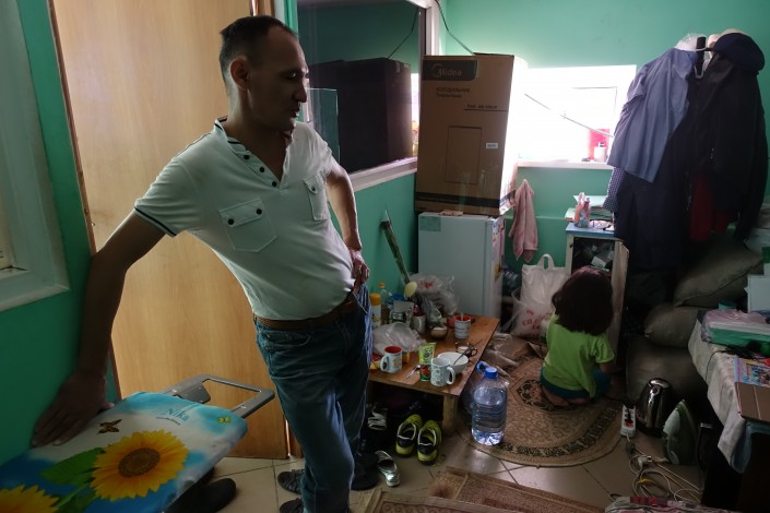 Со своими двумя детьми Исатай по-прежнему живет в крохотной подсобке, которая находится в комнате ожидания автомойки.