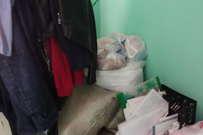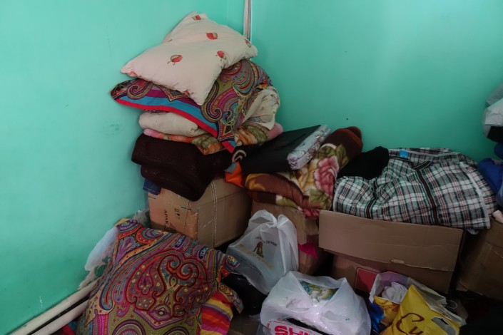 В углу напротив - мешки с крупами и другими сухими продуктами - это все тоже помощь. "Эти продукты привезли еще весной, всего пять мешков, я их по сортам разложил", - говорит Исатай.