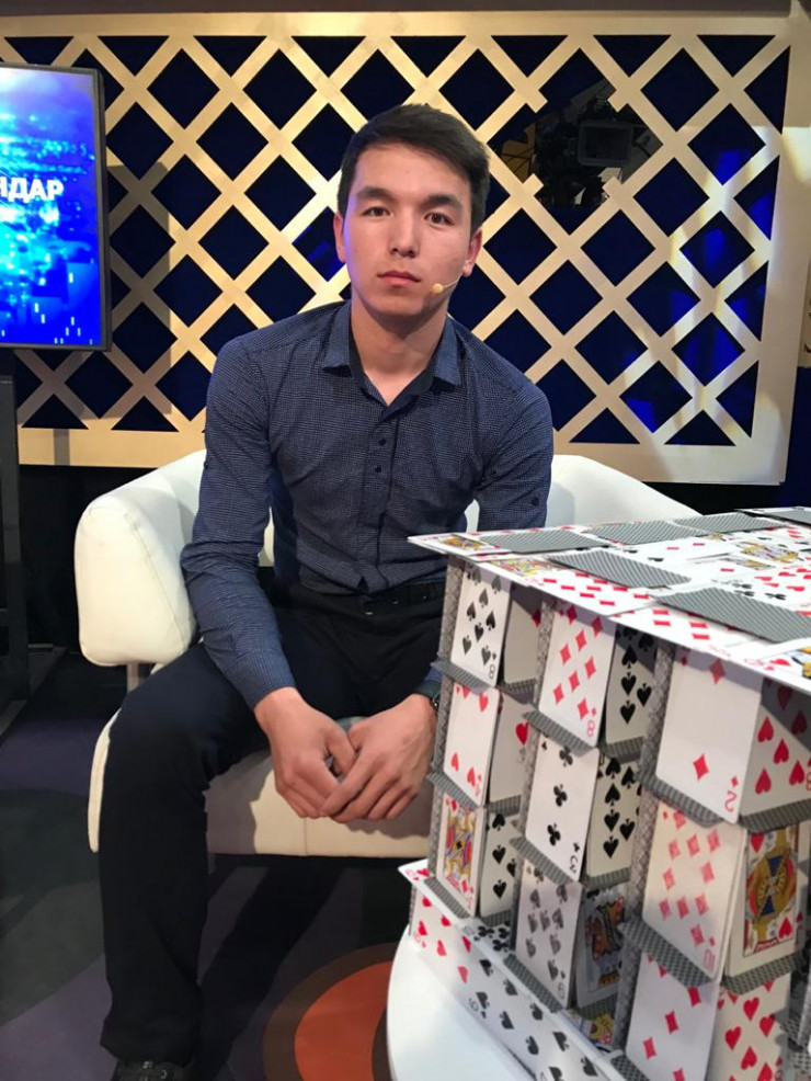 "А еще мне запомнился молодой человек, который собрал самый большой карточный дом, - говорит Бахытжан Тастулеков. - Это был макет здания без скрепляющих устройств и клея высотой 180 см. На создание дома ушло более трех суток и 200 колод игральных карт".