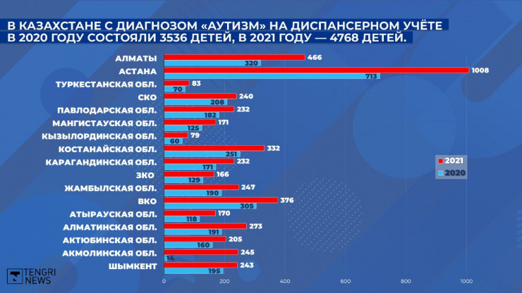 Согласно данным Министерства здравоохранения, ежегодно увеличивается количество детей, состоящих на учете с расстройством аутистического спектра (РАС). Если в 2020 году с диагнозом "аутизм" на учете состояло 3536 детей, то в 2021 году количество увеличилось до 4768.