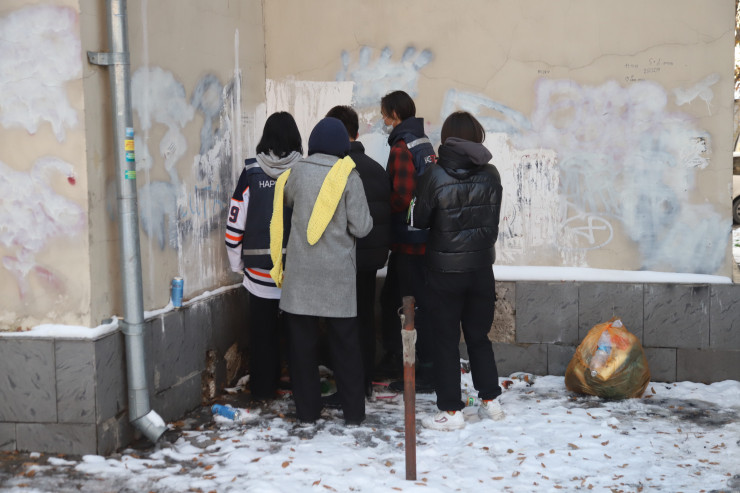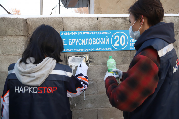 Дальше мы едем еще на одну точку, там нас уже ждут волонтеры. Эти ребята закрашивают граффити-рекламу наркотика, которая в прямом смысле этого слова убивает их ровесников. Сегодня они работают в квадрате Райымбека - Брусиловского.
