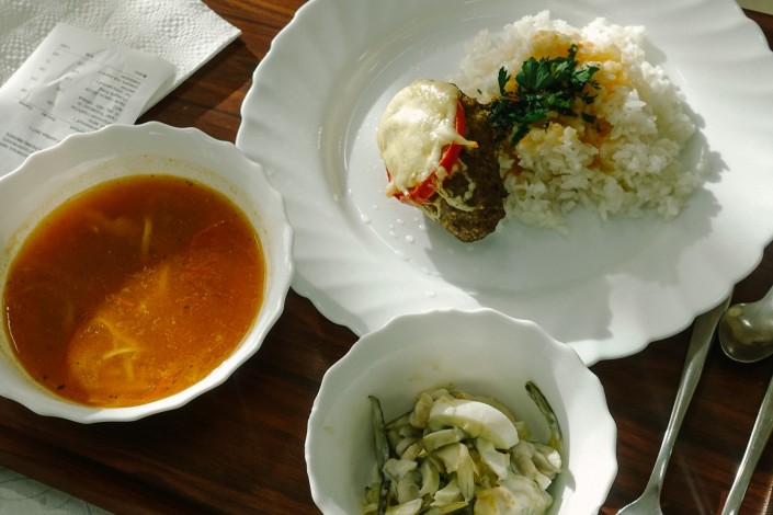 Обед в столовой обойдется в 1200 тенге и выше. К примеру, суп харчо с мясом - 216 тенге, семга с овощами - 1047 тенге или говядина с баклажанами - 526 тенге, рис с брокколи - 177 тенге, салат из свеклы с курагой - 91 тенге, чай с молоком - 46 тенге.