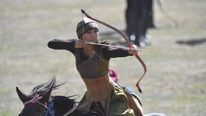 Девушкой на фото оказалась лучница из Кыргызстана, 19-летняя ученица Аиды Акматовой. На сегодня в группе их четверо. Чтобы овладеть этим искусством, девушки начали тренироваться с 7-8 лет.