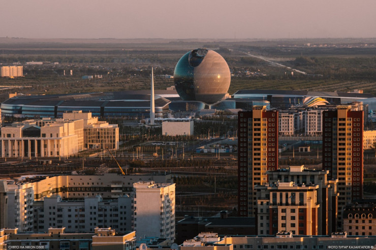 Шар на фоне - павильон сферы "Нұр Әлем" построенный к Expo 2017. В нем по-прежнему проводится выставка по теме возобновляемых источников энергии.