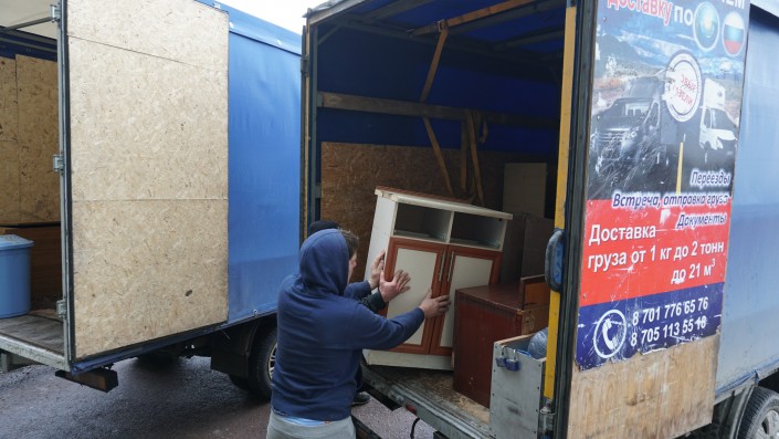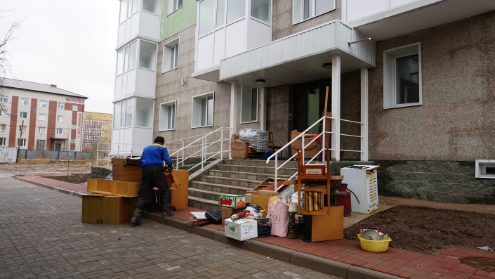 Люди грузят мебель и другие вещи в "Газели". Местные жители получили ключи от новых квартир и переезжают.