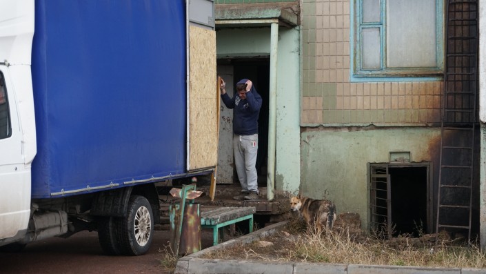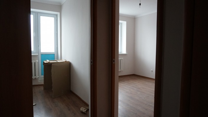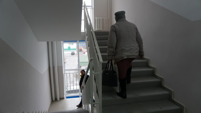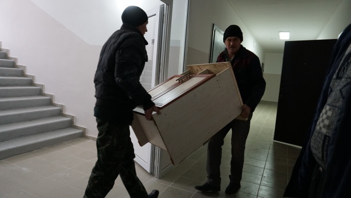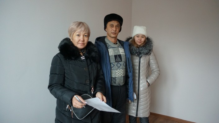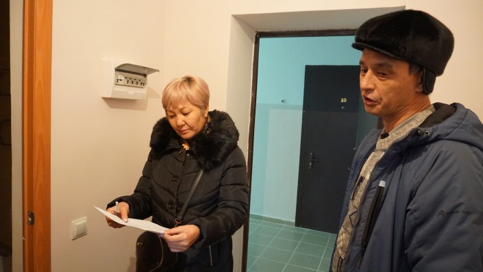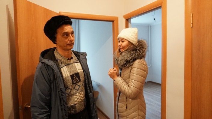 Местный активист Жандарбек, или, как его все называют, Жора, не спешит проявлять радость. Он очень внимательно проверяет выданные его семье две квартиры. К жилым помещениям у него есть претензии.