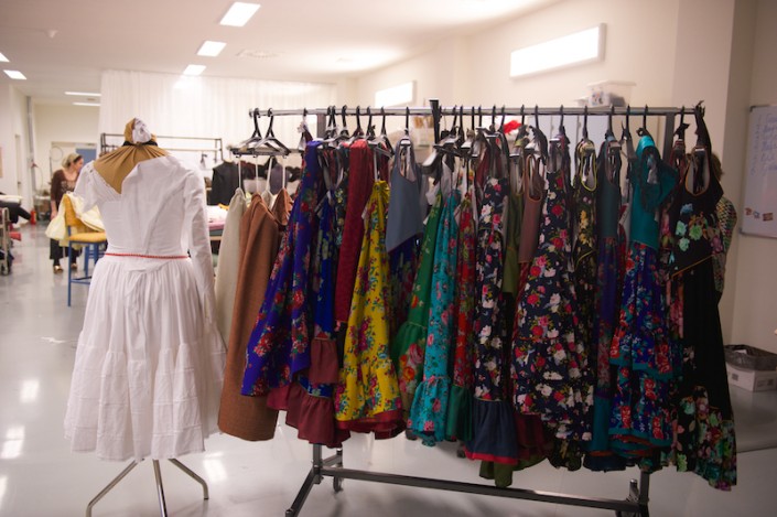 Художник-сценограф Эцио Фриджерио проверяет, правильно ли бутафоры использовали все оттенки, где-то добавляет свои штрихи. Очень интересной получилась сцена ярмарки. Здесь все как на настоящем испанском рынке - шляпы и сумки, фрукты и овощи представлены в изобилии. Сумки сделаны со специальными потертостями, чтобы под светом софитов могли выглядеть естественно, в противном случае при попадании на них театрального света, они рискуют стать глянцевыми и "выбьются" из общего стиля постановки.
