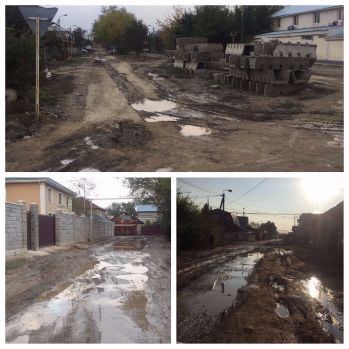 Еще один читатель из Алматы просит обратить внимание акима Ауэзовского района на состояние дорог в микрорайоне "Алтын Бесик". По его словам, каждый раз после дождя дорога в микрорайоне превращается в сплошное месиво из грязи и глины. Как выяснилось, асфальт там был, но его сняли еще в апреле из-за ремонта водопроводных труб.