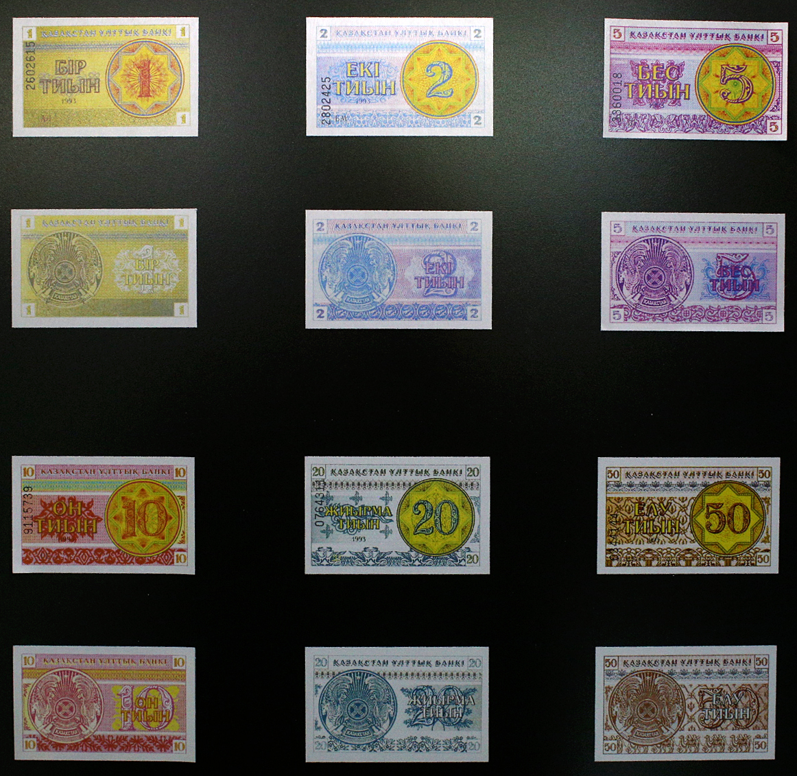 Они выпускались двумя сериями: монеты образца 1994 года и образца 1998 года. Хотя некоторые монеты образца 1998 года выпускались позже, они были выполнены в едином стиле и поэтому включались в эту серию. Монеты образца 1994 года состояли из следующих номиналов тиынов и тенге: 2, 5, 10, 20, 50 тиын и 1, 3, 5, 10, 20 тенге.