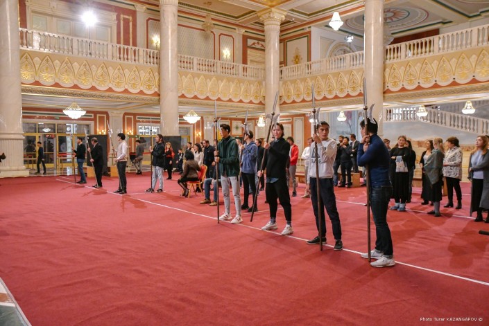 На улице пасмурно и идет дождь. А в фойе театра "Астана Опера" идет грандиозная репетиция. Мраморный зал театра обычно служит для сбора гостей, но сейчас тут импровизированная сцена, где артисты готовят финальную сцену одного из актов новой постановки.
