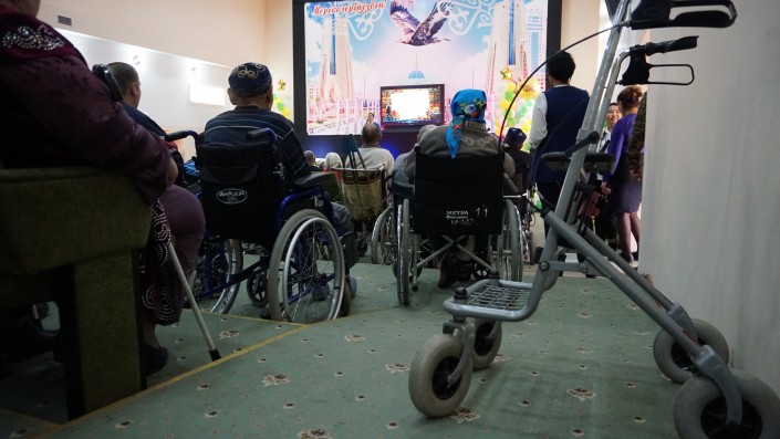 Прошло четыре года. Город Нур-Султан. К месту в первом ряду в концертном зале Линника снова сопровождает молодежь.