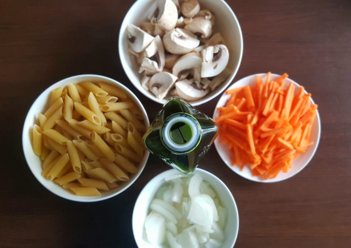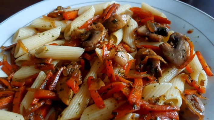 Гарнир готовил как обычно, а вот грибы специально порезал крупно и обжарил в оливковом масле - так они больше были похожи на мясо. Мелко натертая морковь, макароны аль-денте, немного приправ... и получилось довольно сносно, и даже вкусно. Читая о том, как я подбирал замену мясу, многие из веганов сейчас наверняка заскрипели зубами, но зная, насколько эти люди чутко относятся к своей идеологии, я еще раз напомню - мой отказ от мяса носит характер эксперимента,и я заранее прошу прощения, если делаю что-то не так.