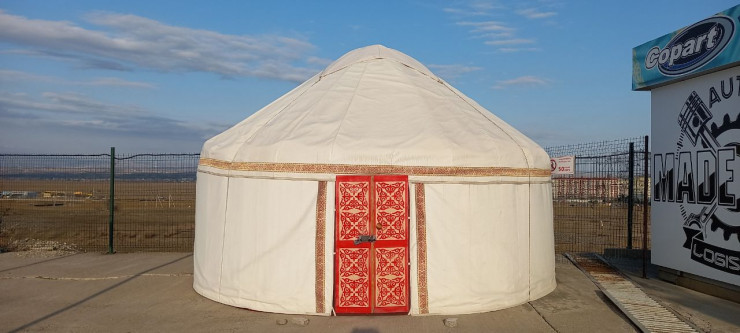 Казахстанский флаг можно увидеть так же часто, как и грузинский. Все потому, что огромная часть машин уходит отсюда в Казахстан либо для личного пользования, либо на продажу. Кто-то для привлечения клиентов здесь даже поставил юрту.