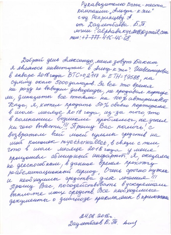 "Она мне рассказывала, что скоро откроется компания Alpha Cash, если хочешь, можешь вложить в нее. Говорила, это надежные люди, что она уже с ними имела дело и хорошо заработала. Потом она мне уже звонила в сентябре, сказать, что они открылись, и спрашивала, хочу ли я вложить деньги. Она мне говорила: "Я тоже буду вкладывать, у меня муж продает машину для этого". Как раз был конец года, был подъем хороший криптовалюты, они вложили и заработали", - вспоминает Меруерт.