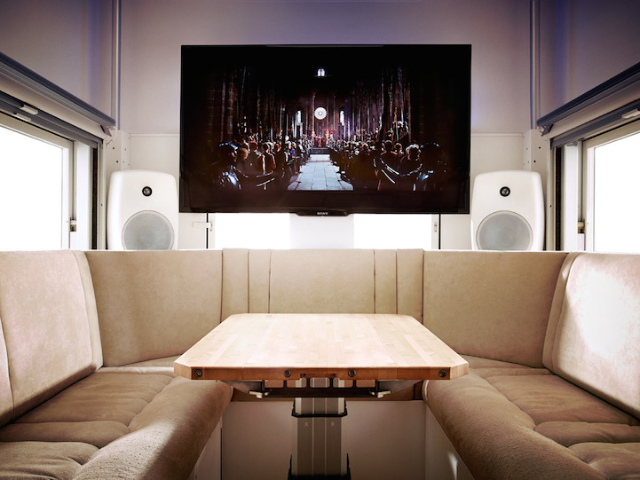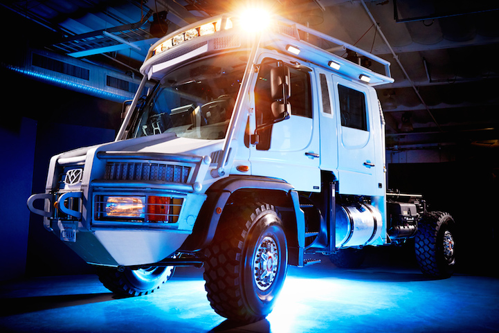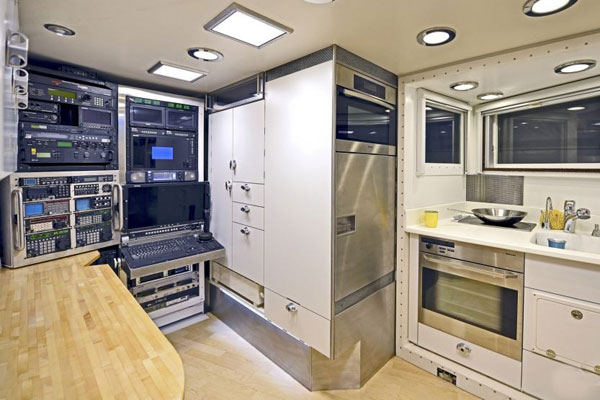 Помимо этого, в доме на колесах для разведки местности есть радиоуправляемые летательные аппараты с камерами и мотоцикл с турбодизельным двигателем. В кузове авто разместились полноценная кухня, спальня для семьи из трех человек и хранилище для провизии на две-три недели. При необходимости совершения более долгих поездок вездеход можно оборудовать дополнительными секциями для хранения продуктов.