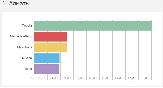 "Но если копнуть глубже и рассмотреть ситуацию не в масштабе страны, а в пределах городов, то можно найти и исключение из правил. Рассмотрев вторичный рынок в пяти городах с наибольшей долей перерегистраций (Алматы, Астана, Шымкент, Караганда и Тараз), мы вывели отдельный рейтинг популярности марок среди б/у автомобилей", - пишет издание.