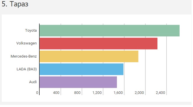 Замыкает ТОП-5 городов с наибольшей долей перерегистраций (с результатом более 15 тысяч) Тараз. Лидером здесь, как и практически во всех других населенных пунктах, стала Toyota (более 2,6 тысячи). На второй и третьей строчке закрепились "немцы" - Volkswagen (2,2 тысячи) и Mercedes-Benz (1,8 тысячи).