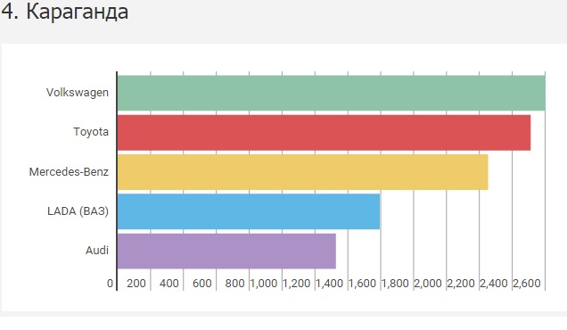 В 2015 году в Караганде оказалось 18 тысяч перерегистраций легковых автомобилей. Город является единственным в стране, где Toyota лидером не является. Лидером оказался Volkswagen с результатом 2,6 тысячи регистраций. Toyota довольствуется "серебром" (2,5 тысячи), а "бронзу" заработал Mercedes-Benz (2,2 тысячи).