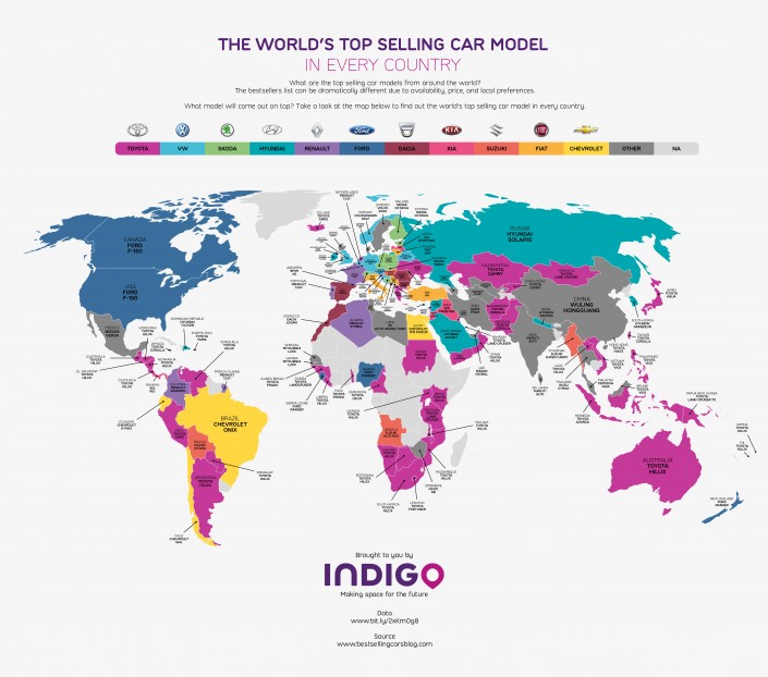 Первое место в рейтинге занял пикап Toyota Hilux, возглавивший продажи в 25 странах. На втором месте расположился Volkswagen Golf, который пользуется особым спросом в Европе. Замыкает тройку лидеров Toyota Land Сruiser, популярная в Африке и на Ближнем Востоке. В Северной Америке бессменным лидером остается "тяжеловоз" Ford F-150.