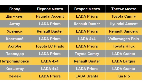 Как и в Атырау, в Усть-Каменогорске наиболее популярной моделью на рынке новых авто является LADA. Покупатели в этом городе отдают предпочтение внедорожнику 4×4. Он, кстати говоря, собирается тут же. Второе и третье место тоже досталось "ладам", а именно Priora и Granta. Последняя с недавнего времени также стоит на конвейере в Усть-Каменогорске.