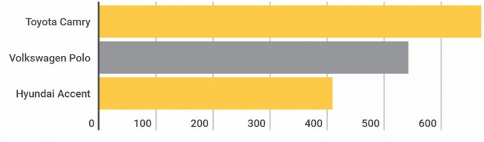 По информации аналитиков, почти треть всех продаж на официальном рынке страны приходится на Алматы. В минувшем году однозначным лидером в городе был седан Hyundai Accent - в алматинских шоу-румах продали почти 2,7 тысячи таких автомобилей. В этом году, по информации издания, Accent "провалился" очень сильно, во многом из-за резкого скачка цены. За 7 месяцев 2016 года дилерам удалось продать чуть более 400 машин. На этом фоне на первое место в Алматы вышла Toyota Camry с результатом около 670 авто.
