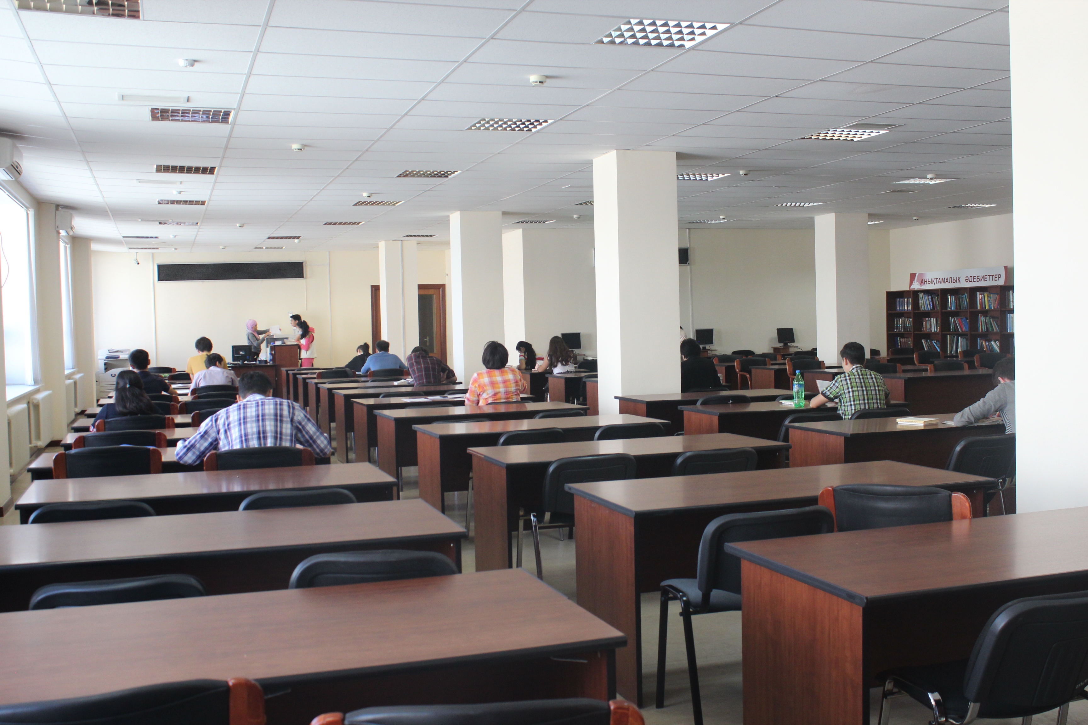Заглянули мы и в зал научной литературы. По словам руководителя читального зала Куляш Оразовой, в летнее время читателей становится меньше. "В основном, студенты приходят, люди, которые занимаются научной деятельностью, абитуриенты, школьники. У нас очень много читателей: в день по 150-200 человек приходят", - сказала она. Библиотекарь отметила, что посетители часто запрашивают литературу по истории, медицине, спорту, искусству. Пользуются спросом книги на казахском языке.