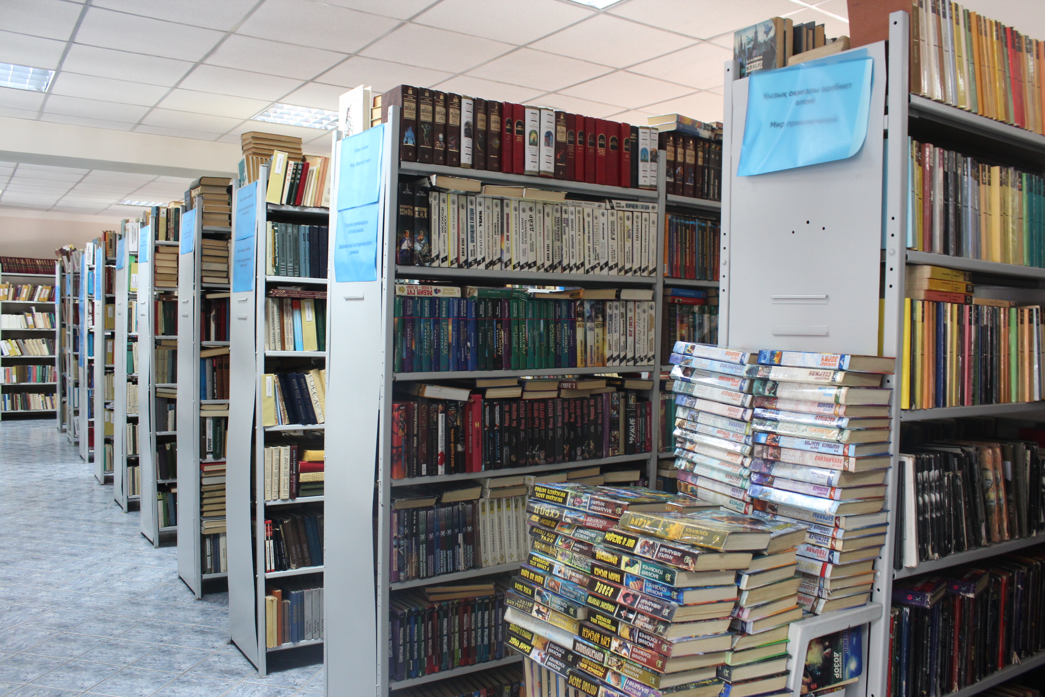 Начали мы с самой крупной библиотеки города - Национальной академической, а именно с отдела художественной литературы. Здесь книги выдаются на дом. "У нас 4700 читателей, в день у нас бывает в среднем по 60 читателей или больше. Молодежи много у нас. Сейчас в летнее время очень много школьников, которые читают по школьной программе, мы помогаем им выбирать литературу. Пенсионеры тоже приходят. Вообще, контингент у нас разнообразный, можно сказать, что все ходят, кто любит читать", - сказала руководитель абонемента художественной литературы Майра Нурканова.