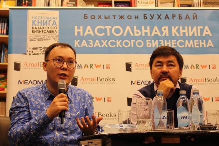 Автор книги Бахытжан Бухарбай (слева) и предприниматель Маргулан Сейсембай (справа) на презентации книги. Фото: Даулет Ашимхан