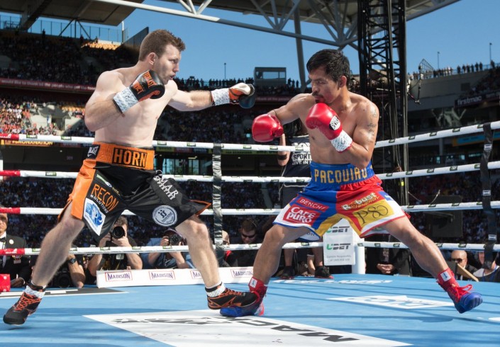 В шестом раунде Хорн правым ударом серьезно потряс Мэнни, и все же Пакьяо устоял на ногах. В середине боя филиппинец уже не имел явного преимущества над соперником, поскольку хозяин ринга умело контратаковал и даже атаковал. Плюс ему в этом помогали габариты.