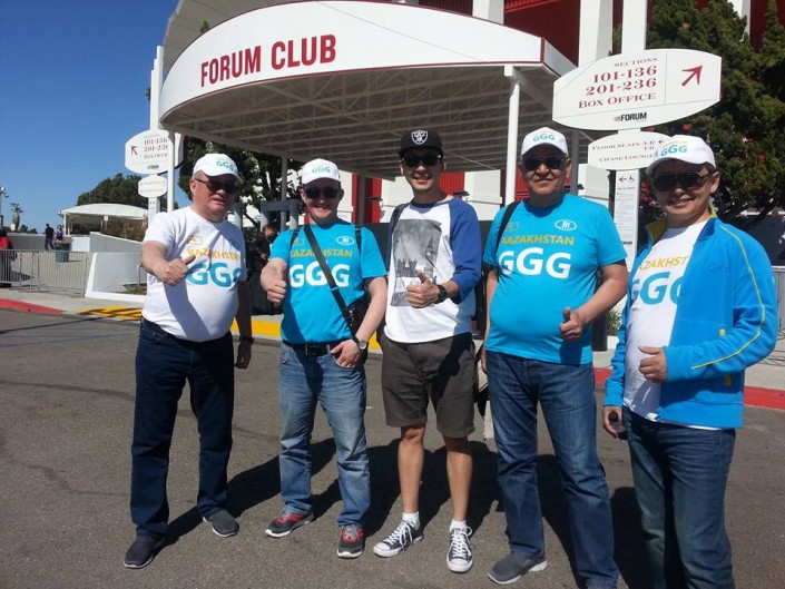 "На входе также бесплатно раздавали чехлы для сотовых телефонов с Головкиным, и опять-таки с беркутом под солнцем. И их разбирали, как горячие хот-доги. Также было много болельщиков из Казахстана с флагами. Кто-то специально приехал на бой, кто-то приехал к детям-студентам, а кого-то даже отправили спонсоры. Последние выделялись из толпы одинаковыми ярко-бирюзовыми футболками. К ним я специально подошел познакомиться и попросил сфотографироваться. Они были рады и с удовольствием согласились. Атмосфера царила праздничная и с казахским акцентом", - заметил студент.