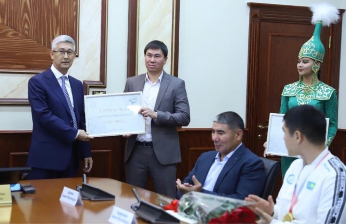 Первому тренеру боксера вручили сертификат на три миллиона тенге, а его нынешнему наставнику Жакиеву - на пять миллионов тенге.