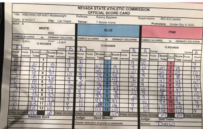 Бой состоялся утром 17 сентября на арене T-Mobile в Лас-Вегасе и продлился все 12 раундов. По их итогам судьи не смогли определить победителя и была объявлена ничья (118-110 Альваресу, 115-113 Головкину, 114-114).