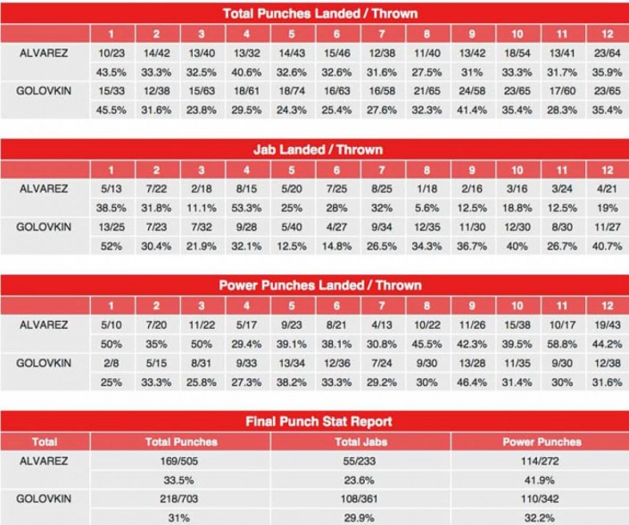 Альварес выполнил гораздо меньше ударов (505), но и их точность оказалась выше - 169 ударов достигли своей цели (33,5 процента). Соотношение джебов у мексиканца составило 233 на 55 (23,6 процента), силовых ударов - 272 на 114 (41,9 процента).