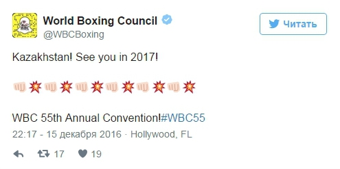 "Казахстан, увидимся в 2017 году. 55-я ежегодная конвенция WBC", - говорится в официальном твиттере организации.