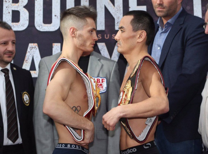 Казахстанский боксер Жанат Жакиянов, владеющий титулом чемпиона мира по версии WBA в легчайшем весе, и чемпион IBF ирландец Райан Барнетт провели официальное взвешивание и последнюю дуэль взглядов перед объединительным боем.