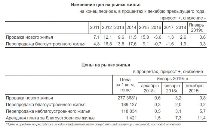 Сейчас средняя цена на один квадратный метр нового жилья составляет 277 368 тенге. За год стоимость выросла на 3,2 процента. Благоустроенное жилье на вторичном рынке продают в среднем за 189 127 тенге за квадратный метр, неблагоустроенное - за 118 834 тенге. Рост цен за год составил 2 и 3,1 процента, соответственно.