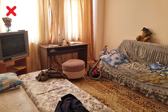 Перед съемкой вовсе не обязательно проводить генеральную уборку. Достаточно спрятать висящую на стуле одежду, тапки, разбросанные игрушки, мелкую бытовую технику и избавиться от пыли в общедоступных местах. На это уйдет не так много времени, как кажется на первый взгляд. Чтобы превратить зал из катастрофы в приличную комнату, нам понадобилось всего десять минут.