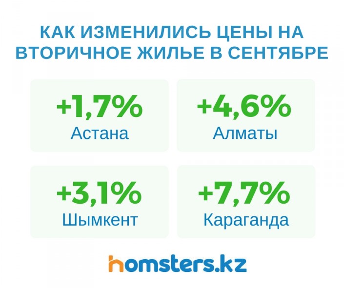 По данным аналитиков, цены на вторичное жилье после нескольких месяцев практически постоянного снижения в сентябре выросли во всех крупных городах Казахстана. Так, старый жилой фонд в начале осени подорожал: в Астане на 1,7 процента, до 325,9 тысячи тенге за квадратный метр, в Алматы на 4,6 процента, до 365,6 тысячи тенге, в Шымкенте на 3,1 процента, до 203,8 тысячи тенге, в Караганде на 7,7 процента, до 194,9 тысячи тенге.
